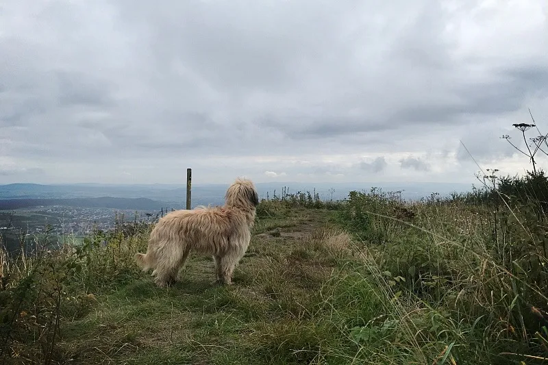 Der Parkplatz befindet sich unterhalb des Hohen Dörnberg und es geht sofort mit einer leichten Steigung am Berg entlang. Die Strecke (Rundweg 4) ist schön zu laufen - es geht vorbei an den großen Pferdekoppeln und man hat einen tollen Blick auf die Helfensteine und den kleinen Dörnberg. Gubacca war ganz in seinem Element und es fehlte eigentlich nur noch die Schafherde, die er über die Hügel treiben konnte.